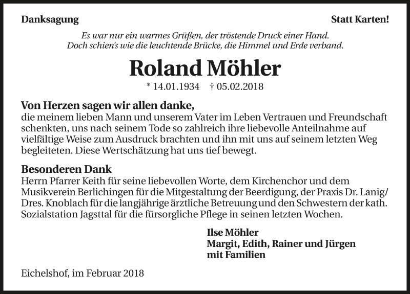 Hier finden Sie alle Traueranzeigen aus der Zeitung, die bisher für Roland Möhler erschienen sind. Weitere Traueranzeigen, die in der Zeitung erscheinen, werden hier ebenfalls aufgelistet