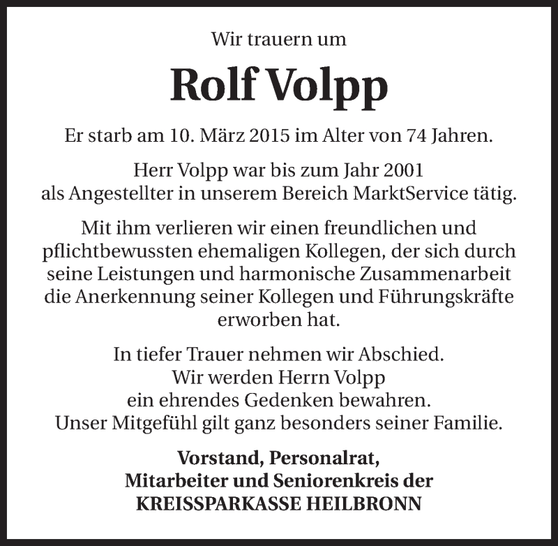 Hier finden Sie alle Traueranzeigen aus der Zeitung, die bisher für Rolf Volpp erschienen sind. Weitere Traueranzeigen, die in der Zeitung erscheinen, werden hier ebenfalls aufgelistet