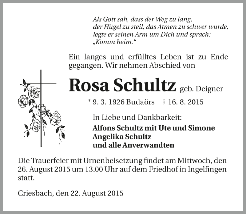 Hier finden Sie alle Traueranzeigen aus der Zeitung, die bisher für Rosa Schultz erschienen sind. Weitere Traueranzeigen, die in der Zeitung erscheinen, werden hier ebenfalls aufgelistet