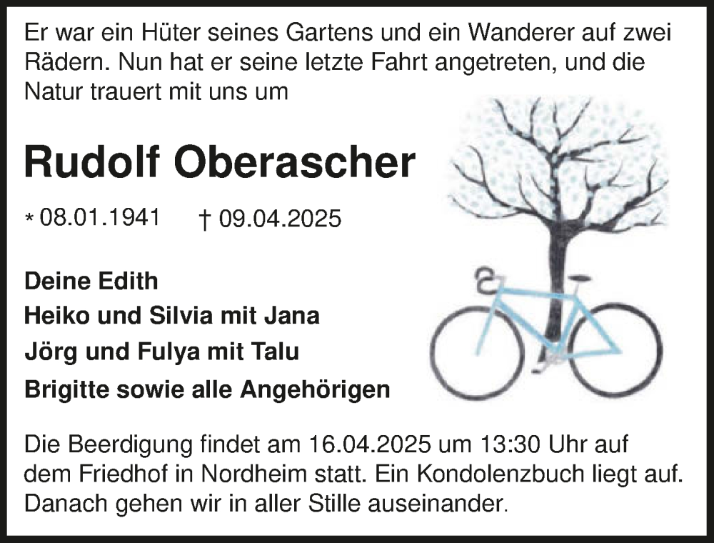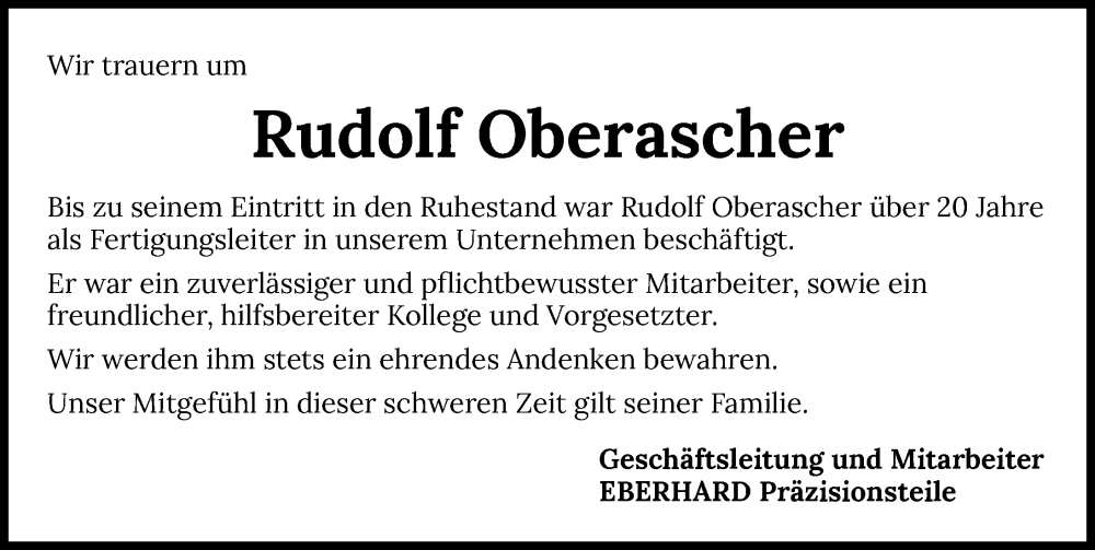 Hier finden Sie alle Traueranzeigen aus der Zeitung, die bisher für Rudolf Oberascher erschienen sind. Weitere Traueranzeigen, die in der Zeitung erscheinen, werden hier ebenfalls aufgelistet