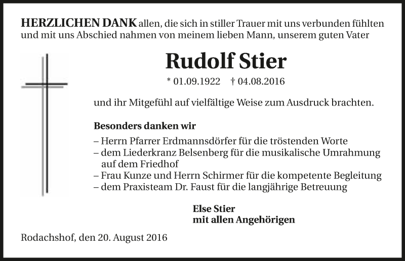 Hier finden Sie alle Traueranzeigen aus der Zeitung, die bisher für Rudolf Stier erschienen sind. Weitere Traueranzeigen, die in der Zeitung erscheinen, werden hier ebenfalls aufgelistet