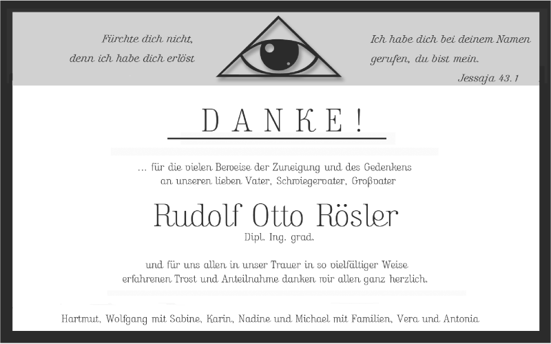 Hier finden Sie alle Traueranzeigen aus der Zeitung, die bisher für Rudolf Otto Rösler erschienen sind. Weitere Traueranzeigen, die in der Zeitung erscheinen, werden hier ebenfalls aufgelistet