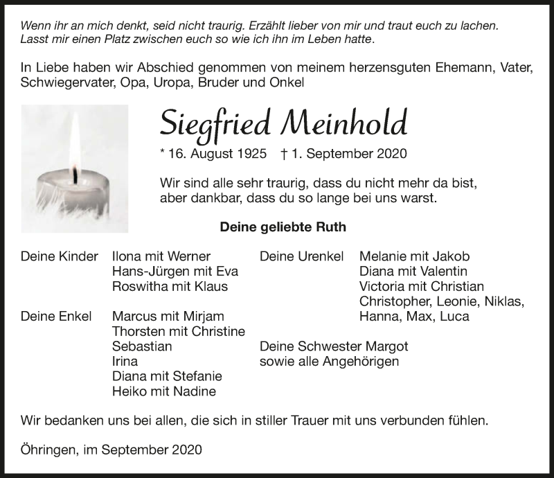 Hier finden Sie alle Traueranzeigen aus der Zeitung, die bisher für Siegfried Meinhold erschienen sind. Weitere Traueranzeigen, die in der Zeitung erscheinen, werden hier ebenfalls aufgelistet