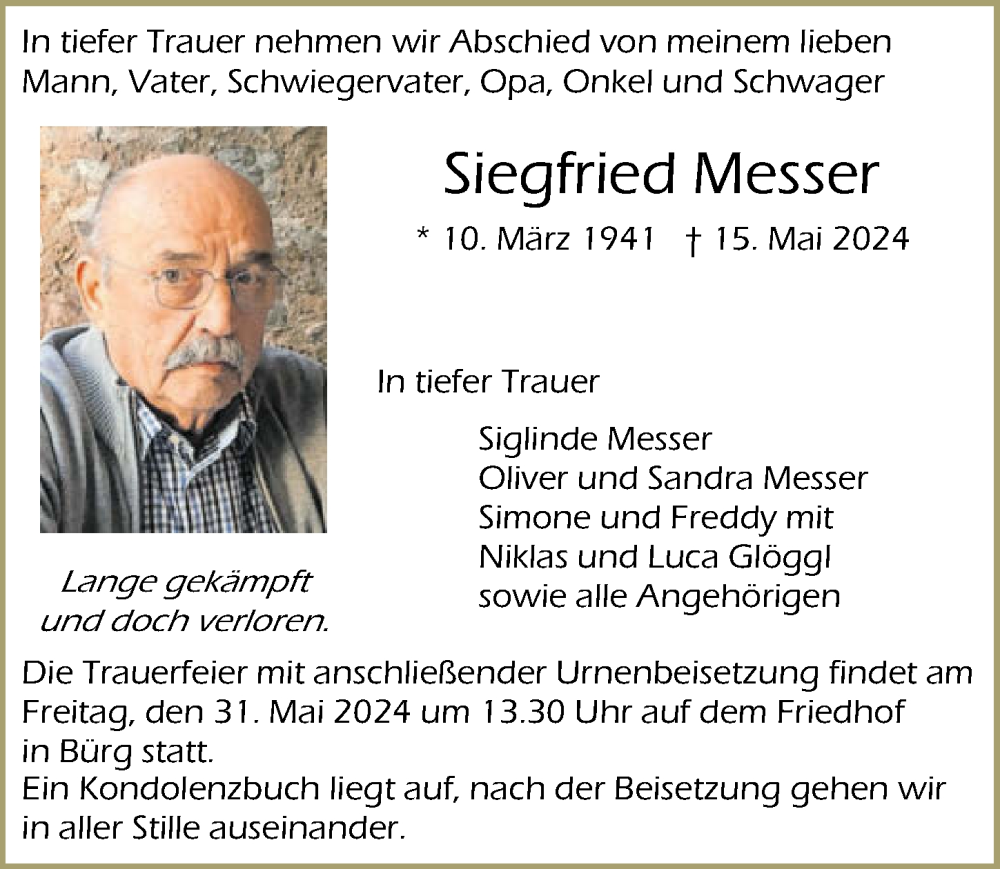 Hier finden Sie alle Traueranzeigen aus der Zeitung, die bisher für Siegfried Messer erschienen sind. Weitere Traueranzeigen, die in der Zeitung erscheinen, werden hier ebenfalls aufgelistet
