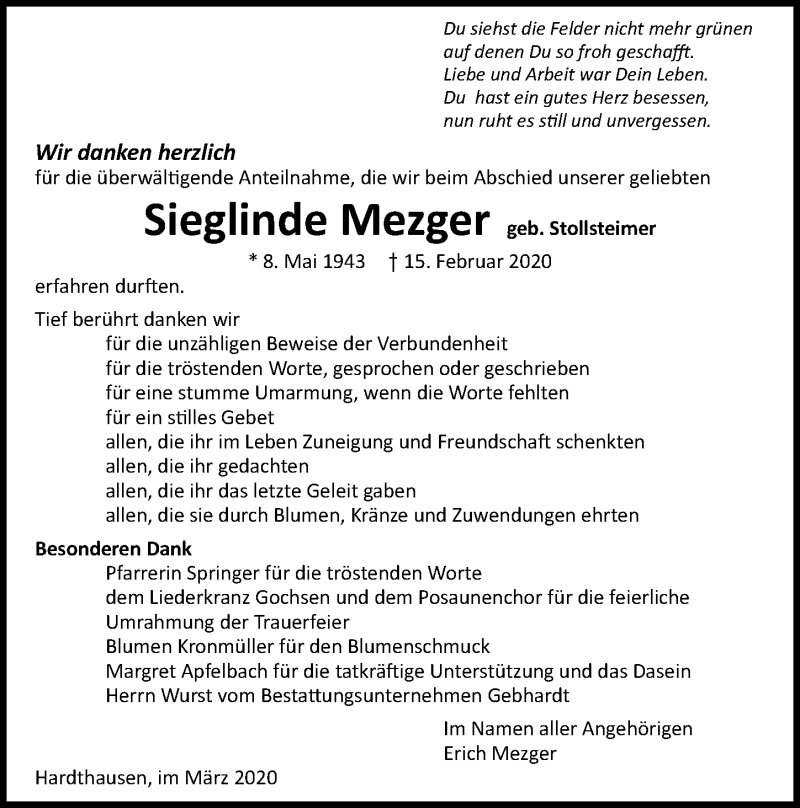 Hier finden Sie alle Traueranzeigen aus der Zeitung, die bisher für Sieglinde Mezger erschienen sind. Weitere Traueranzeigen, die in der Zeitung erscheinen, werden hier ebenfalls aufgelistet
