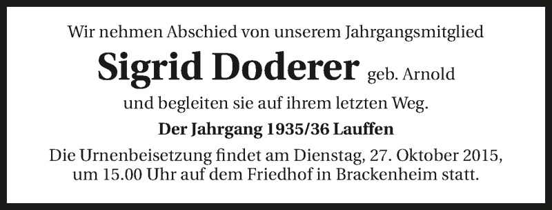 Hier finden Sie alle Traueranzeigen aus der Zeitung, die bisher für Sigrid Doderer erschienen sind. Weitere Traueranzeigen, die in der Zeitung erscheinen, werden hier ebenfalls aufgelistet