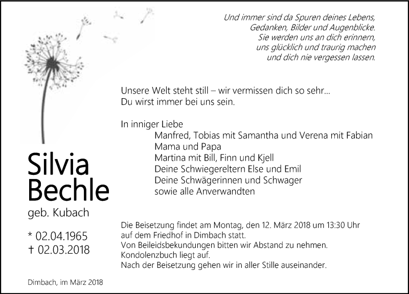 Hier finden Sie alle Traueranzeigen aus der Zeitung, die bisher für Silvia Bechle erschienen sind. Weitere Traueranzeigen, die in der Zeitung erscheinen, werden hier ebenfalls aufgelistet