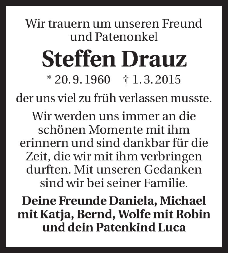 Hier finden Sie alle Traueranzeigen aus der Zeitung, die bisher für Steffen Drauz erschienen sind. Weitere Traueranzeigen, die in der Zeitung erscheinen, werden hier ebenfalls aufgelistet
