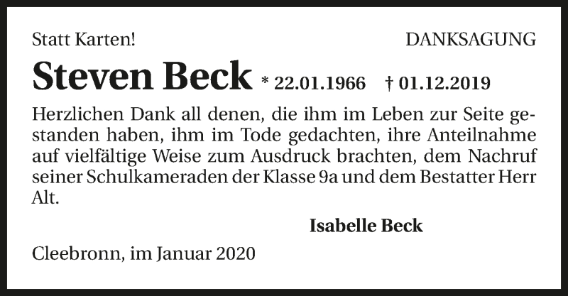 Hier finden Sie alle Traueranzeigen aus der Zeitung, die bisher für Steven Beck erschienen sind. Weitere Traueranzeigen, die in der Zeitung erscheinen, werden hier ebenfalls aufgelistet