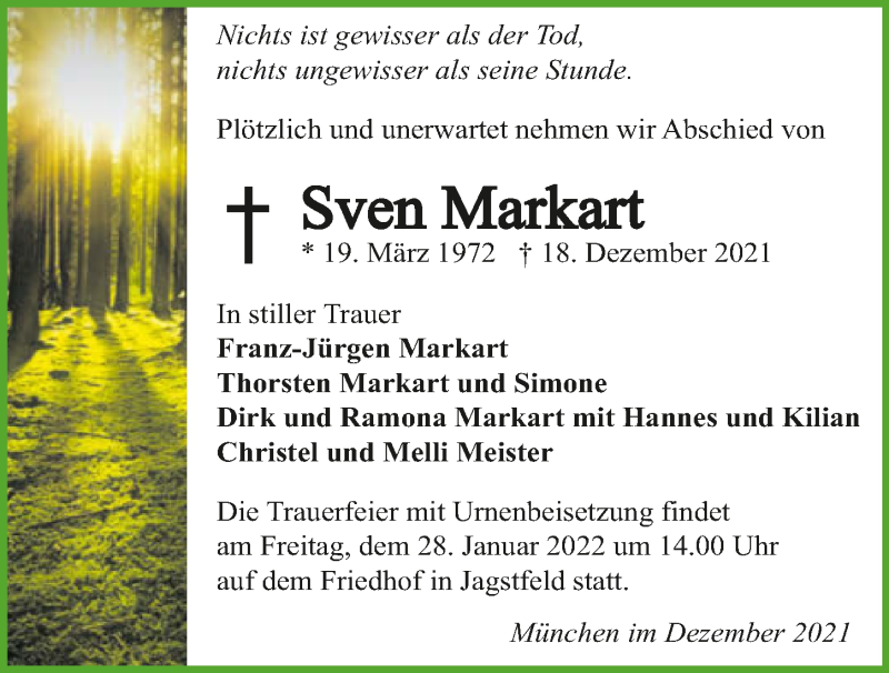 Hier finden Sie alle Traueranzeigen aus der Zeitung, die bisher für Sven Markart erschienen sind. Weitere Traueranzeigen, die in der Zeitung erscheinen, werden hier ebenfalls aufgelistet