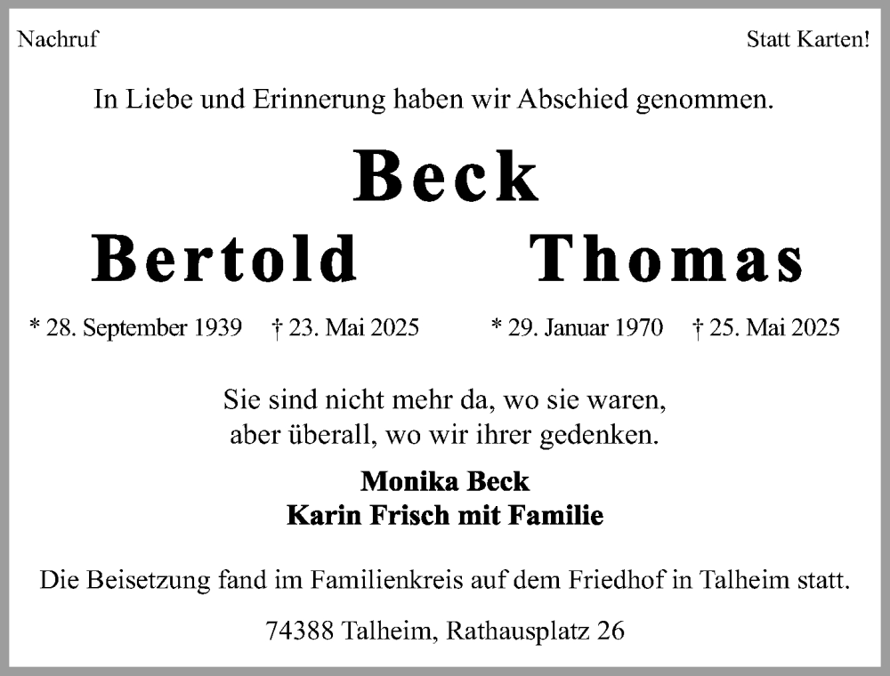 Hier finden Sie alle Traueranzeigen aus der Zeitung, die bisher für Thomas Beck erschienen sind. Weitere Traueranzeigen, die in der Zeitung erscheinen, werden hier ebenfalls aufgelistet