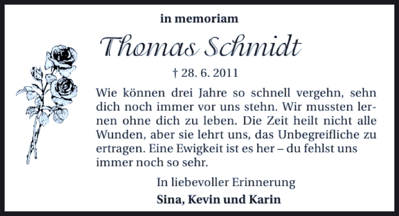 Hier finden Sie alle Traueranzeigen aus der Zeitung, die bisher für Thomas Schmidt erschienen sind. Weitere Traueranzeigen, die in der Zeitung erscheinen, werden hier ebenfalls aufgelistet