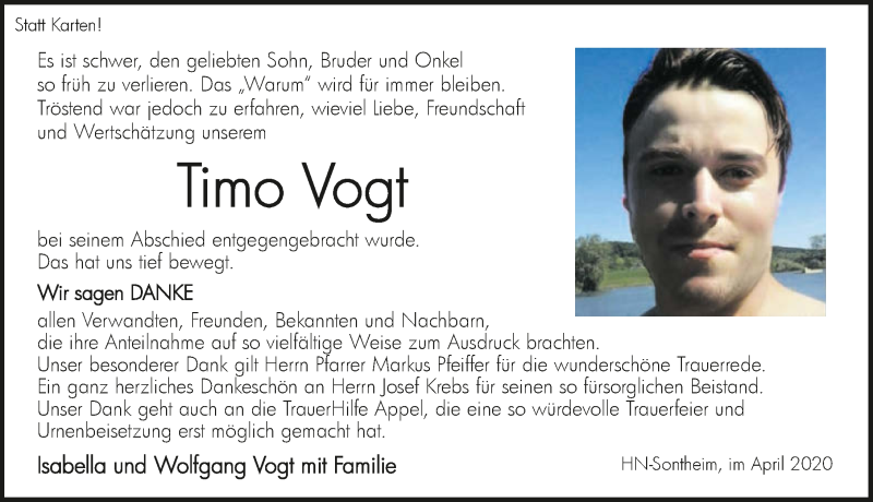 Hier finden Sie alle Traueranzeigen aus der Zeitung, die bisher für Timo Vogt erschienen sind. Weitere Traueranzeigen, die in der Zeitung erscheinen, werden hier ebenfalls aufgelistet