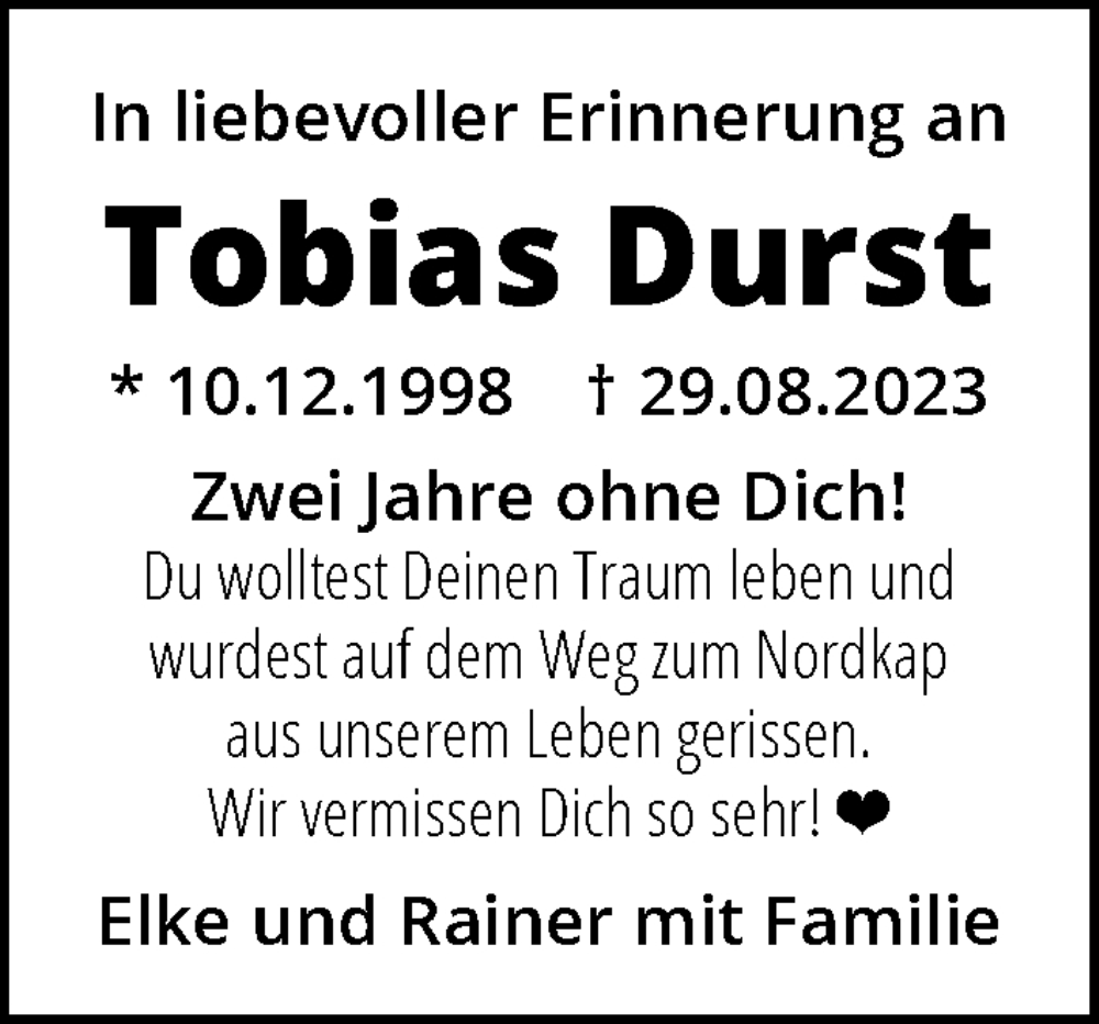 Hier finden Sie alle Traueranzeigen aus der Zeitung, die bisher für Tobias Durst erschienen sind. Weitere Traueranzeigen, die in der Zeitung erscheinen, werden hier ebenfalls aufgelistet