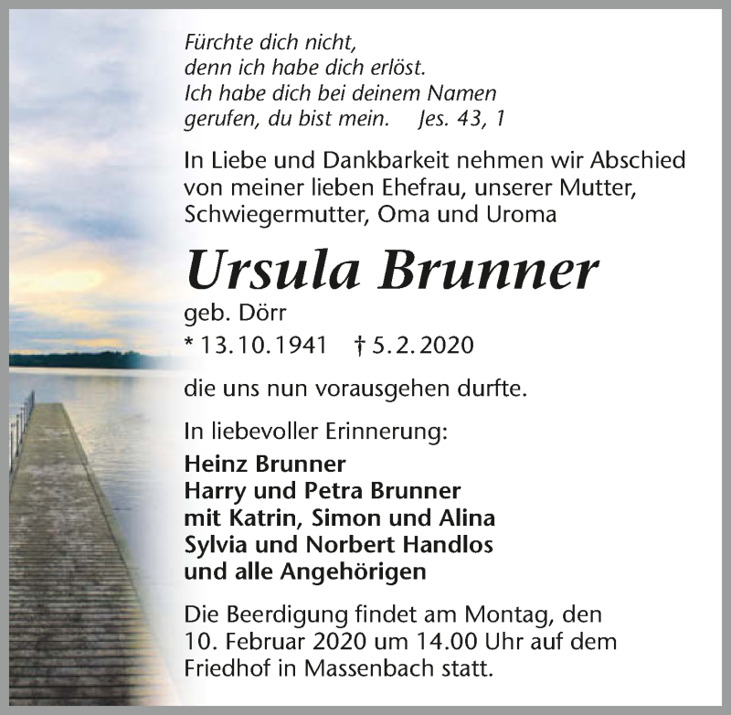 Hier finden Sie alle Traueranzeigen aus der Zeitung, die bisher für Ursula Brunner erschienen sind. Weitere Traueranzeigen, die in der Zeitung erscheinen, werden hier ebenfalls aufgelistet