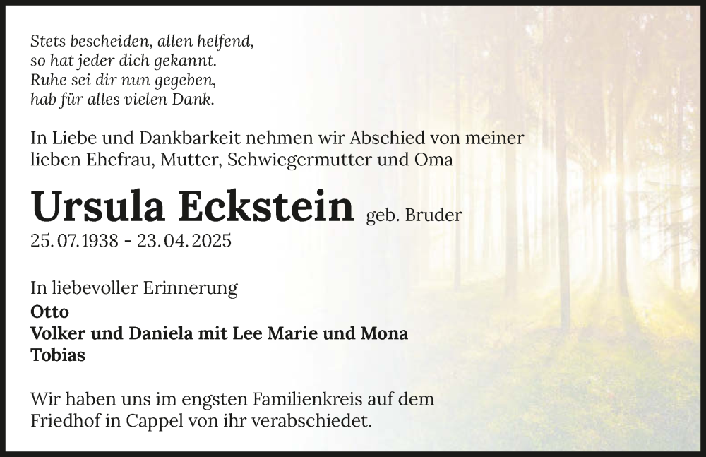 Hier finden Sie alle Traueranzeigen aus der Zeitung, die bisher für Ursula Eckstein erschienen sind. Weitere Traueranzeigen, die in der Zeitung erscheinen, werden hier ebenfalls aufgelistet