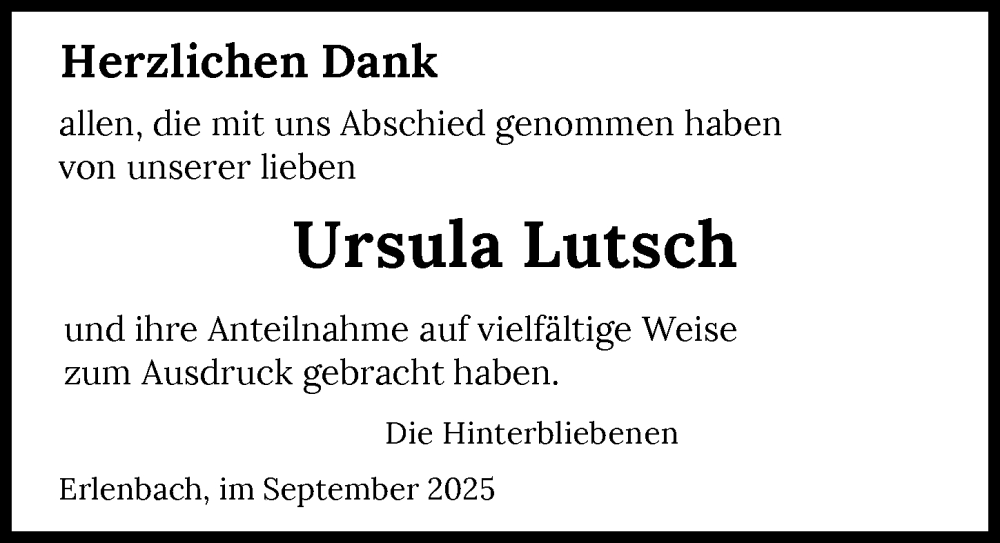 Hier finden Sie alle Traueranzeigen aus der Zeitung, die bisher für Ursula Lutsch erschienen sind. Weitere Traueranzeigen, die in der Zeitung erscheinen, werden hier ebenfalls aufgelistet