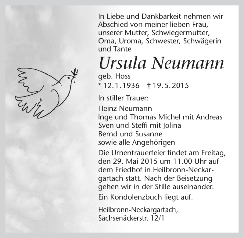 Hier finden Sie alle Traueranzeigen aus der Zeitung, die bisher für Ursula Neumann erschienen sind. Weitere Traueranzeigen, die in der Zeitung erscheinen, werden hier ebenfalls aufgelistet