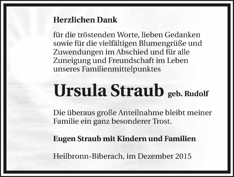 Hier finden Sie alle Traueranzeigen aus der Zeitung, die bisher für Ursula Straub erschienen sind. Weitere Traueranzeigen, die in der Zeitung erscheinen, werden hier ebenfalls aufgelistet