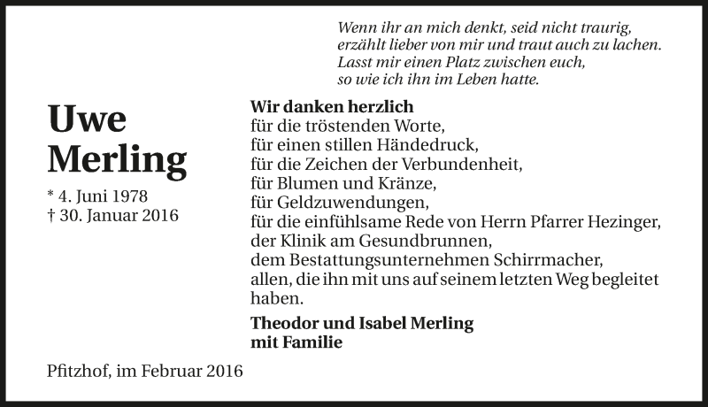 Hier finden Sie alle Traueranzeigen aus der Zeitung, die bisher für Uwe Merling erschienen sind. Weitere Traueranzeigen, die in der Zeitung erscheinen, werden hier ebenfalls aufgelistet