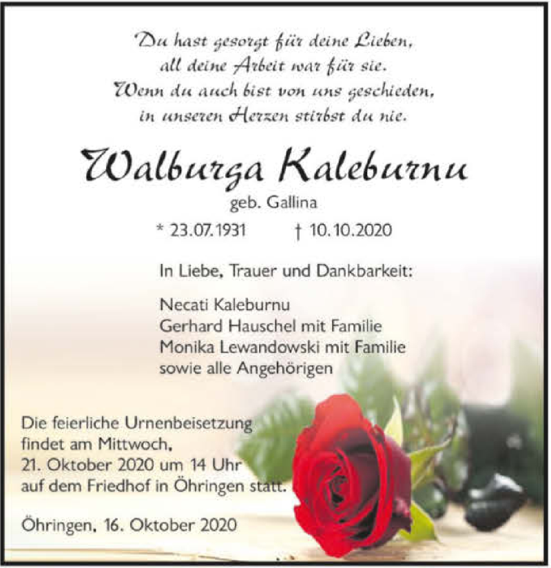Hier finden Sie alle Traueranzeigen aus der Zeitung, die bisher für Walburga Kaleburnu erschienen sind. Weitere Traueranzeigen, die in der Zeitung erscheinen, werden hier ebenfalls aufgelistet