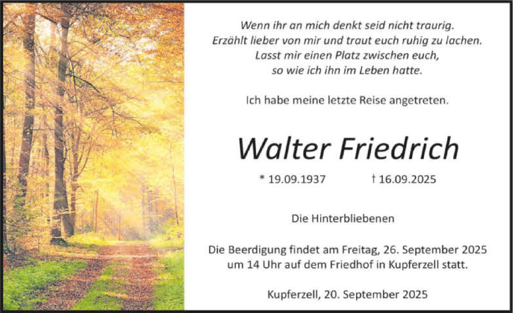 Hier finden Sie alle Traueranzeigen aus der Zeitung, die bisher für Walter Friedrich erschienen sind. Weitere Traueranzeigen, die in der Zeitung erscheinen, werden hier ebenfalls aufgelistet