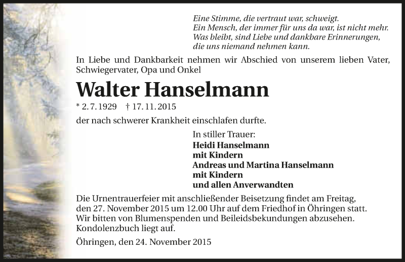 Hier finden Sie alle Traueranzeigen aus der Zeitung, die bisher für Walter Hanselmann erschienen sind. Weitere Traueranzeigen, die in der Zeitung erscheinen, werden hier ebenfalls aufgelistet