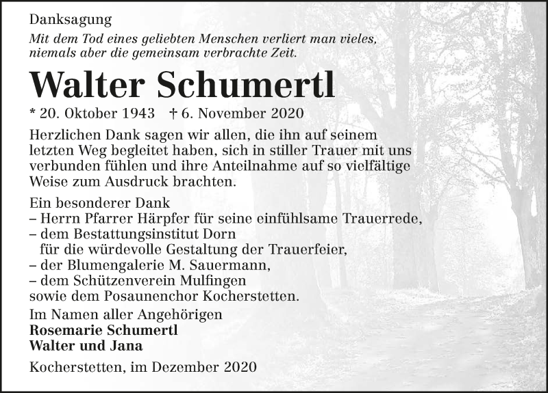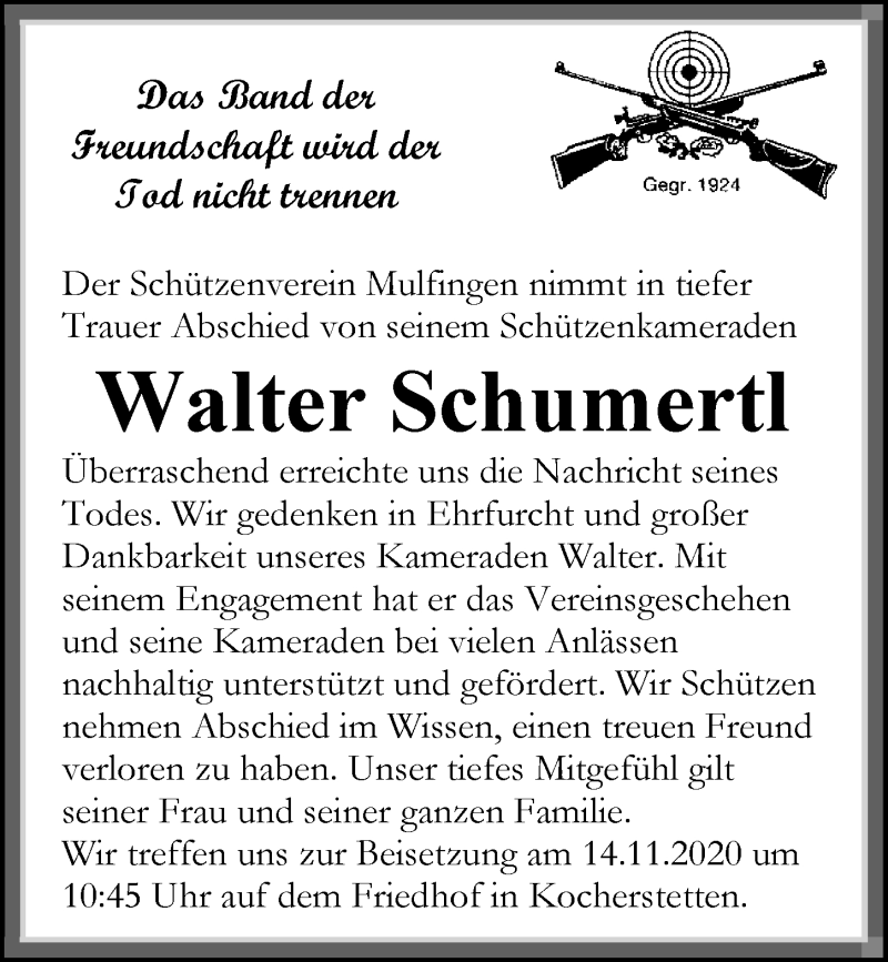 Hier finden Sie alle Traueranzeigen aus der Zeitung, die bisher für Walter Schumertl erschienen sind. Weitere Traueranzeigen, die in der Zeitung erscheinen, werden hier ebenfalls aufgelistet