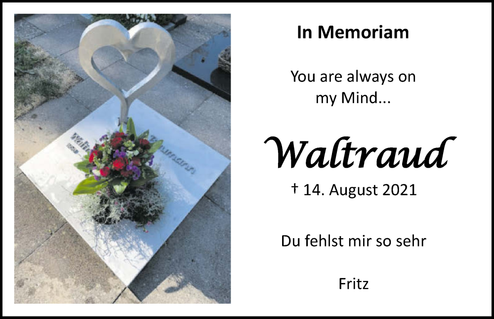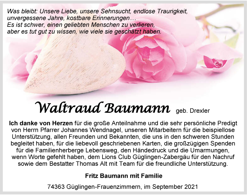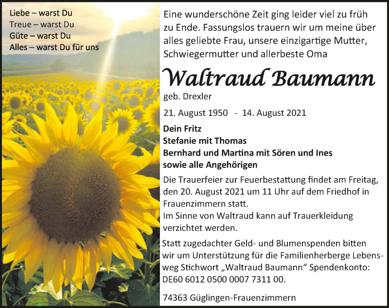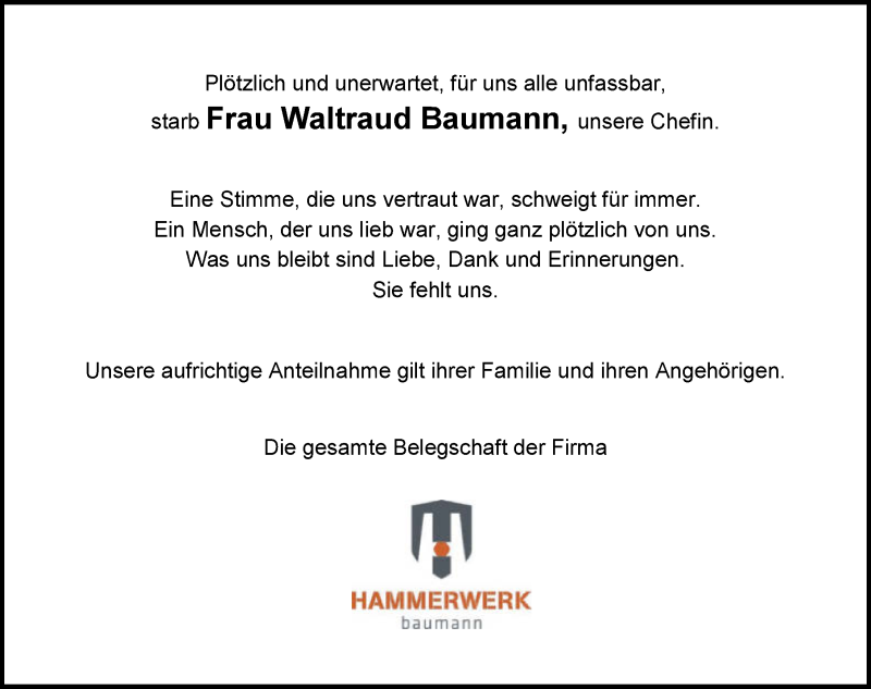 Hier finden Sie alle Traueranzeigen aus der Zeitung, die bisher für Waltraud Baumann erschienen sind. Weitere Traueranzeigen, die in der Zeitung erscheinen, werden hier ebenfalls aufgelistet