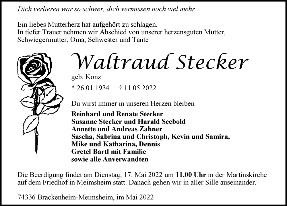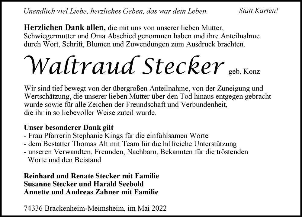 Hier finden Sie alle Traueranzeigen aus der Zeitung, die bisher für Waltraud Stecker erschienen sind. Weitere Traueranzeigen, die in der Zeitung erscheinen, werden hier ebenfalls aufgelistet