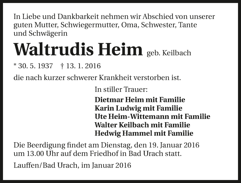 Hier finden Sie alle Traueranzeigen aus der Zeitung, die bisher für Waltrudis Heim erschienen sind. Weitere Traueranzeigen, die in der Zeitung erscheinen, werden hier ebenfalls aufgelistet