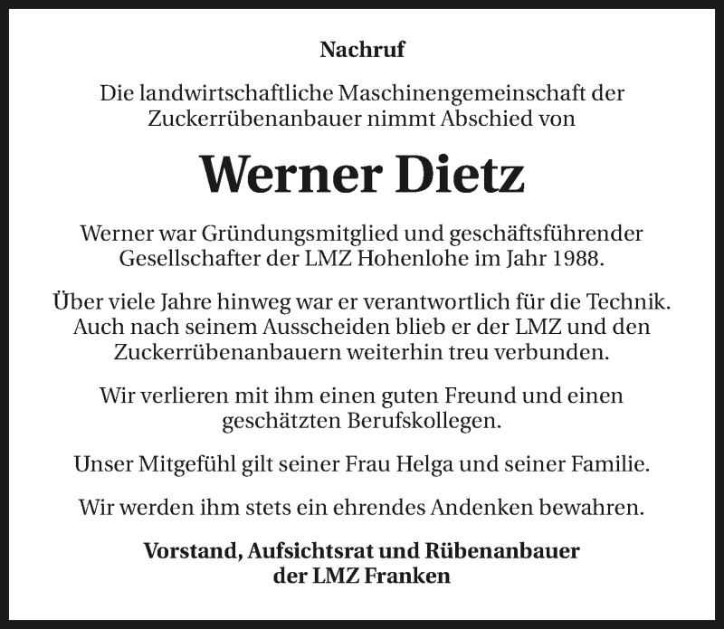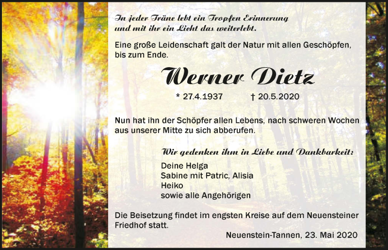 Hier finden Sie alle Traueranzeigen aus der Zeitung, die bisher für Werner Dietz erschienen sind. Weitere Traueranzeigen, die in der Zeitung erscheinen, werden hier ebenfalls aufgelistet