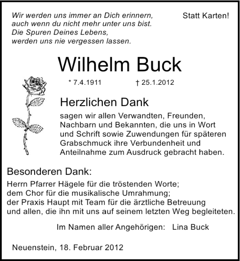 Hier finden Sie alle Traueranzeigen aus der Zeitung, die bisher für Wilhelm Buck erschienen sind. Weitere Traueranzeigen, die in der Zeitung erscheinen, werden hier ebenfalls aufgelistet