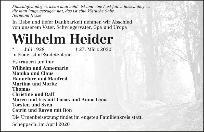 Hier finden Sie alle Traueranzeigen aus der Zeitung, die bisher für Wilhelm Heider erschienen sind. Weitere Traueranzeigen, die in der Zeitung erscheinen, werden hier ebenfalls aufgelistet