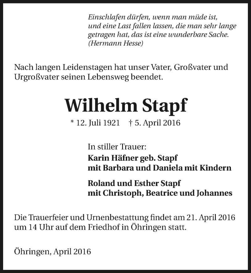 Hier finden Sie alle Traueranzeigen aus der Zeitung, die bisher für Wilhelm Stapf erschienen sind. Weitere Traueranzeigen, die in der Zeitung erscheinen, werden hier ebenfalls aufgelistet