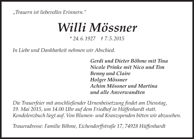 Hier finden Sie alle Traueranzeigen aus der Zeitung, die bisher für Willi Mössner erschienen sind. Weitere Traueranzeigen, die in der Zeitung erscheinen, werden hier ebenfalls aufgelistet