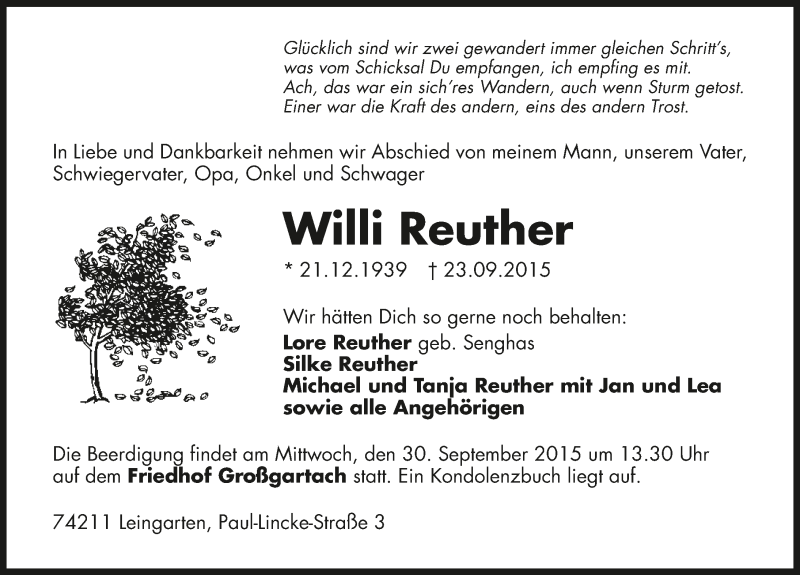 Hier finden Sie alle Traueranzeigen aus der Zeitung, die bisher für Willi Reuther erschienen sind. Weitere Traueranzeigen, die in der Zeitung erscheinen, werden hier ebenfalls aufgelistet