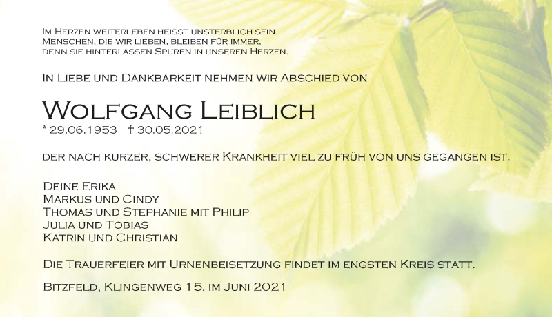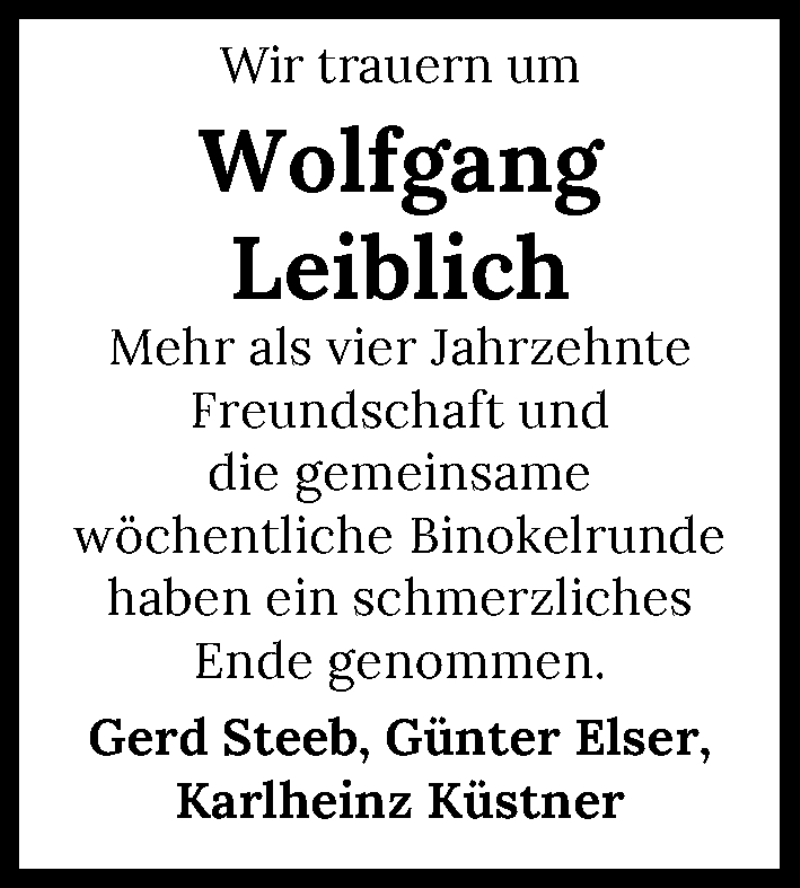 Hier finden Sie alle Traueranzeigen aus der Zeitung, die bisher für Wolfgang Leiblich erschienen sind. Weitere Traueranzeigen, die in der Zeitung erscheinen, werden hier ebenfalls aufgelistet
