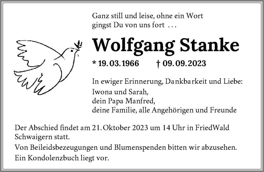 Hier finden Sie alle Traueranzeigen aus der Zeitung, die bisher für Wolfgang Stanke erschienen sind. Weitere Traueranzeigen, die in der Zeitung erscheinen, werden hier ebenfalls aufgelistet