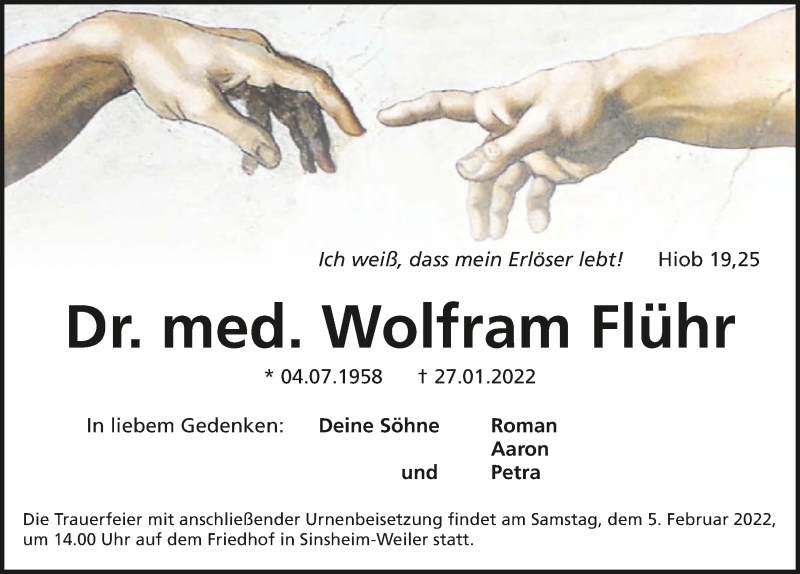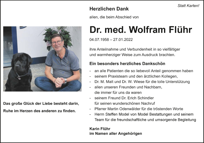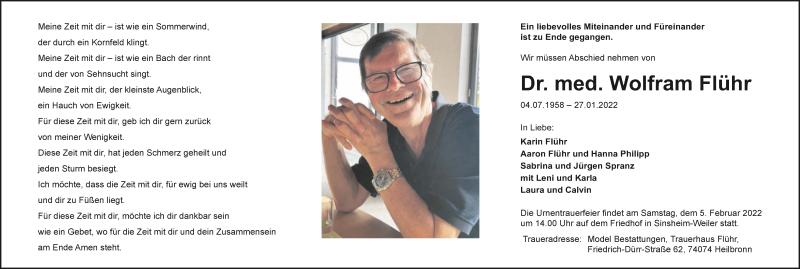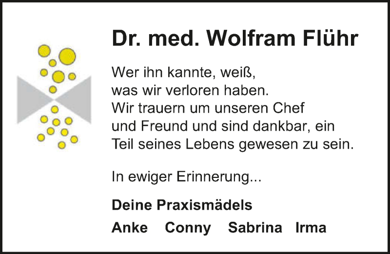 Hier finden Sie alle Traueranzeigen aus der Zeitung, die bisher für Wolfram Flühr erschienen sind. Weitere Traueranzeigen, die in der Zeitung erscheinen, werden hier ebenfalls aufgelistet
