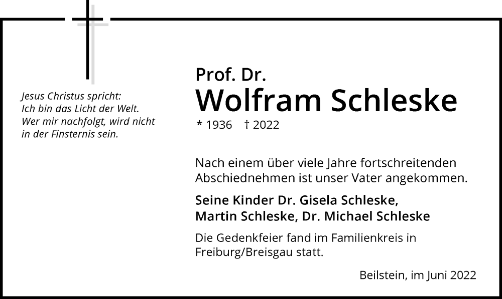 Hier finden Sie alle Traueranzeigen aus der Zeitung, die bisher für Wolfram Schleske erschienen sind. Weitere Traueranzeigen, die in der Zeitung erscheinen, werden hier ebenfalls aufgelistet