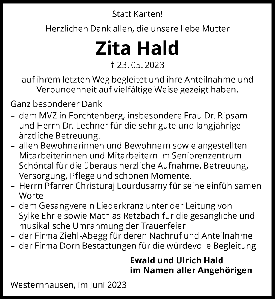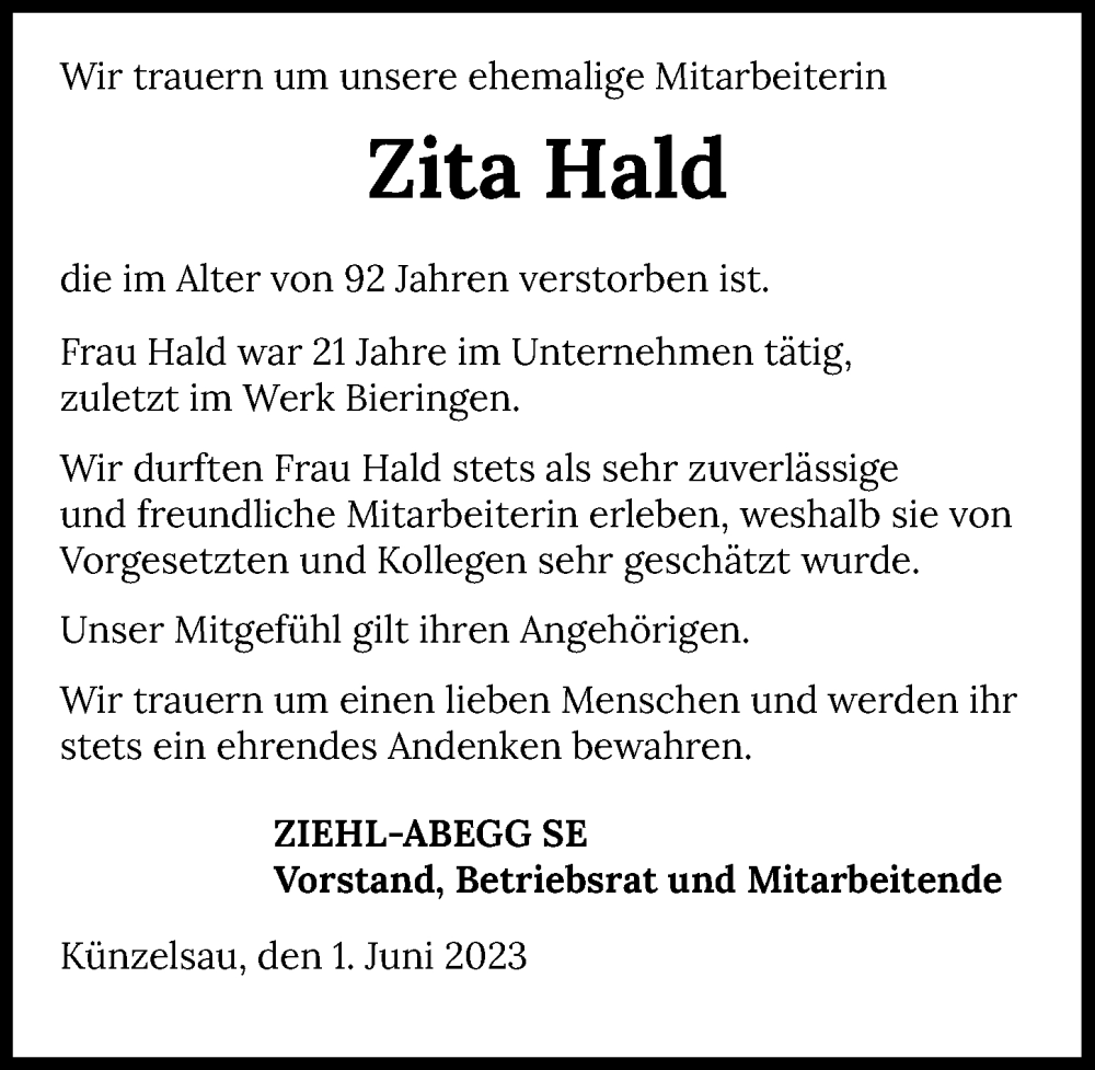 Hier finden Sie alle Traueranzeigen aus der Zeitung, die bisher für Zita Hald erschienen sind. Weitere Traueranzeigen, die in der Zeitung erscheinen, werden hier ebenfalls aufgelistet